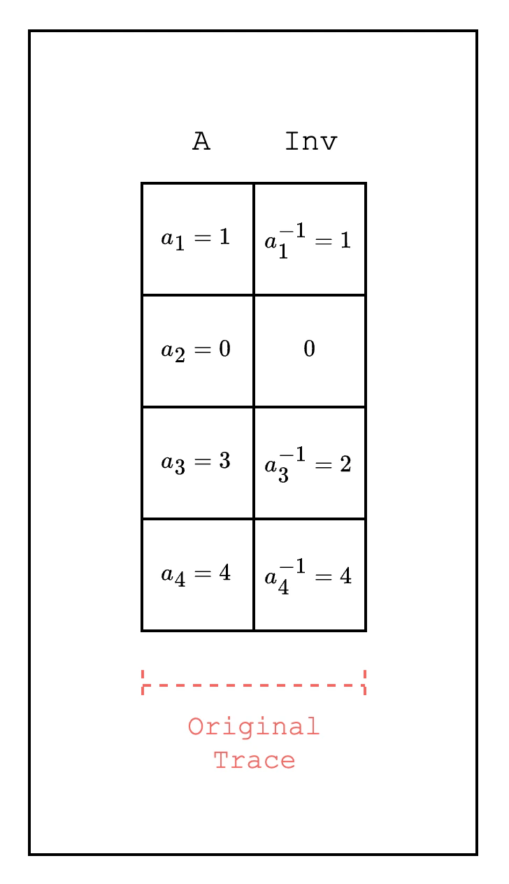 Checking that a certain field element is zero is a common use case when writing AIRs. To do this efficiently, we can use the property of finite fields that a non-zero field element always has a multiplicative inverse. For example, in Figure 2, we want to check whether a field element in is zero. We create a new column that contains the multiplicative inverse of each field element . We then use the multiplication of the two columns and check whether the result is 0 or 1. Note that if the existing column has a zero element, we can insert any value in the new column since the multiplication will always be zero. This way, we can create a constraint that uses theIsZero condition as part of the constraint, e.g. , which checks if is 0 and if is not 0.