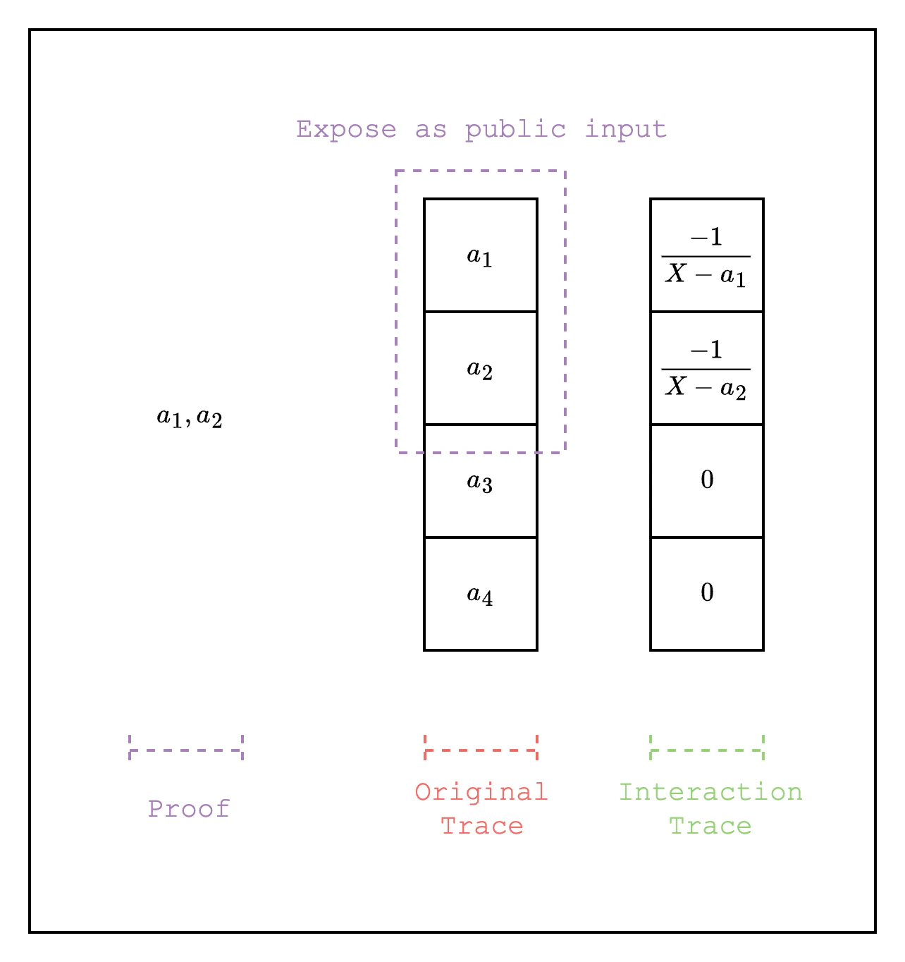 When writing AIRs, we may want to expose some values in the trace to the verifier to check in the open. For example, when running an AIR for a Cairo program, we may want to check that the program that was executed is the correct one. In S-two, we can achieve this by adding the public input portion of the trace as a LogUp column as negative multiplicity. As shown in Figure 3, the public inputs are added as LogUp values with negative multiplicity and . The public inputs are given to the verifier as part of the proof and the verifier can directly compute the LogUp values with positive multiplicity and and add it to the LogUp sum and check that the total sum is 0.