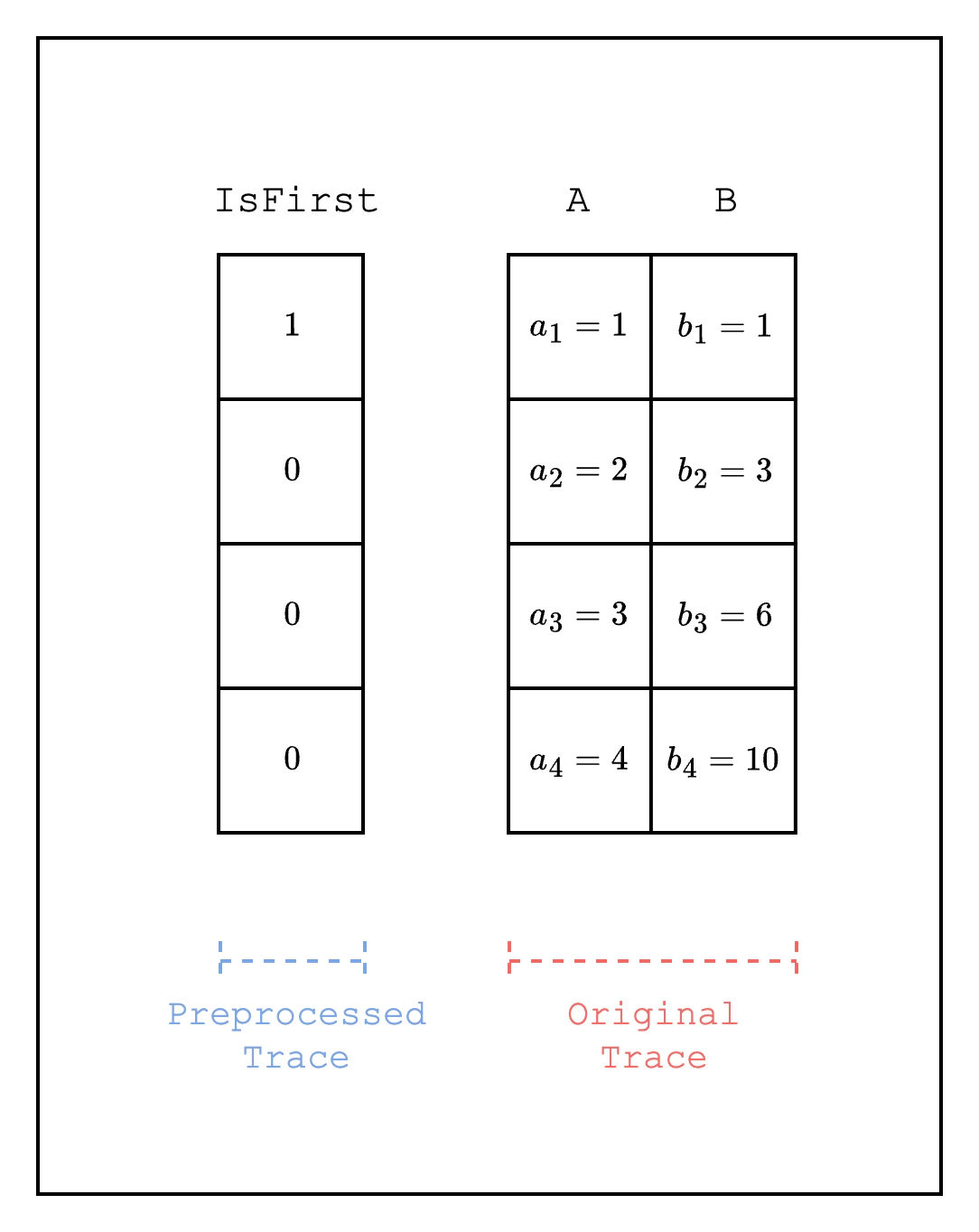 For example, as seen in Figure 1, when we want to track the cumulative sum of a column, i.e. , the previous row of the first row points to the last row, creating an incorrect constraint . Thus, we need to disable the constraint for the first row and enable a separate constraint . This can be achieved by using a selector column that has a value of 1 on the first row and 0 on the other rows and multiplying the constraint by the selector column: