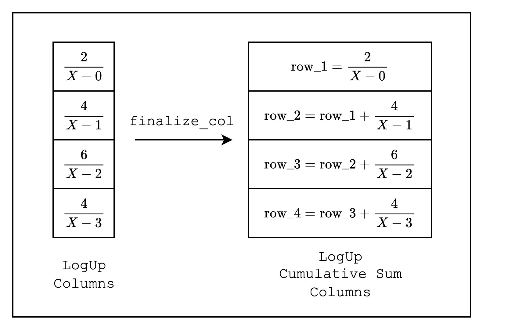 Once we set the fractions for each simd_row, we need to call finalize_col() to finalize the column. This process modifies the LogUp columns from individual fractions to cumulative sums of the fractions as shown in Figure 2.