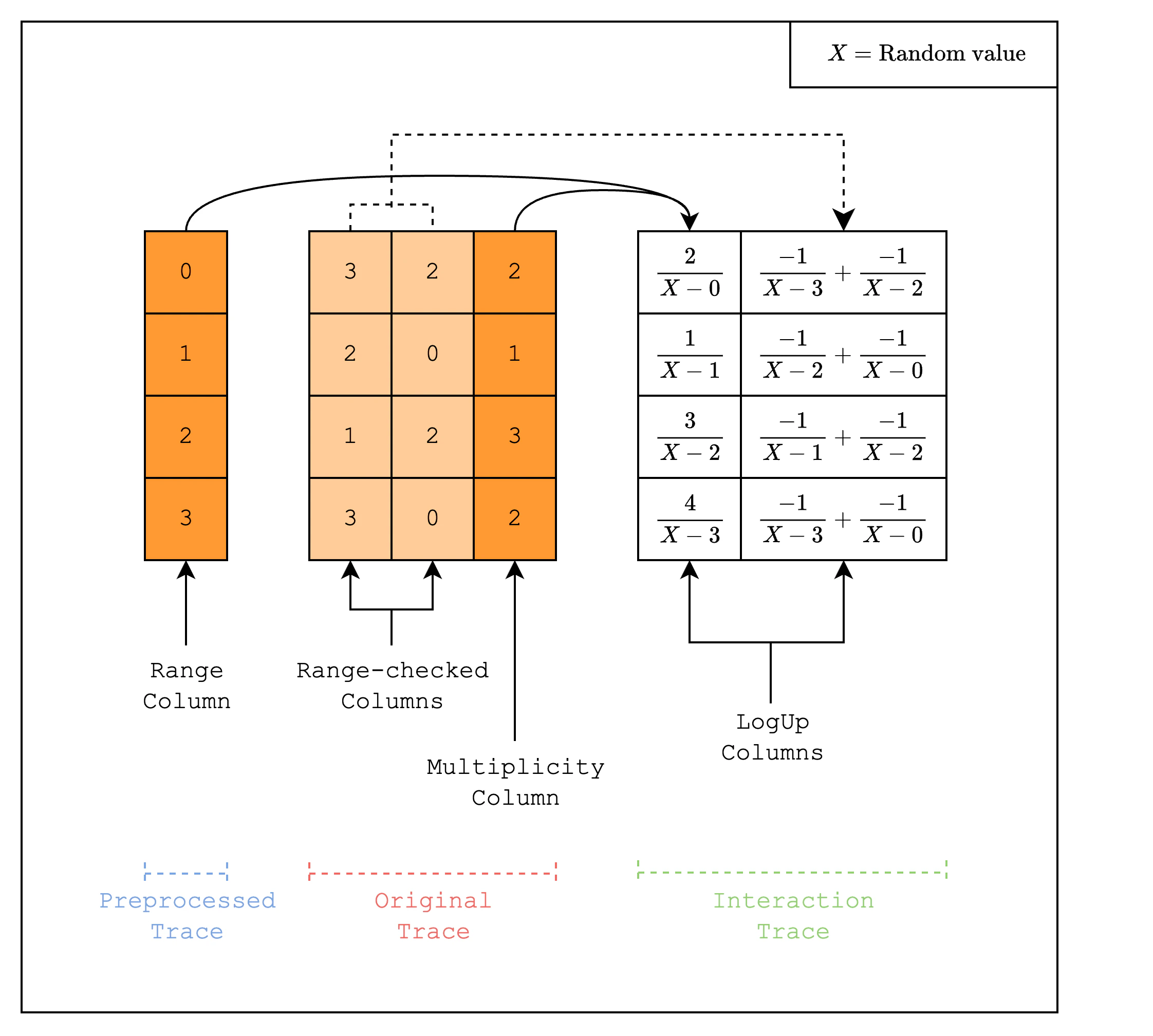 We will now walk through the implementation of a static lookup, which is a lookup where the values that are being looked up are static, i.e. part of the preprocessed trace. Specifically, we will implement a range-check AIR, which checks that a certain value is within a given range. This is especially useful for frameworks like S-two that use finite fields because it allows checking for underflow and overflow. A range-check checks that all values in a column are within a certain range. For example, as in Figure 1, we can check that all values in the range-checked columns are between 0 and 3. We do this by first creating a multiplicity column that counts the number of times each value in the preprocessed trace appears in the range-checked columns. Then, we create two LogUp columns as part of the interaction trace. The first column contains in each row a fraction with numerator equal to the multiplicity and denominator equal to the random linear combination of the value in the range column. For example, for row 1, the fraction should be , where is a random value. The second column contains batches of fractions where the denominator of each fraction is the random linear combination of the value in the range-checked column. Note that the numerator of each fraction is always -1, i.e. we apply a negation, because we want the sum of the first column to be equal to the sum of the second column.
