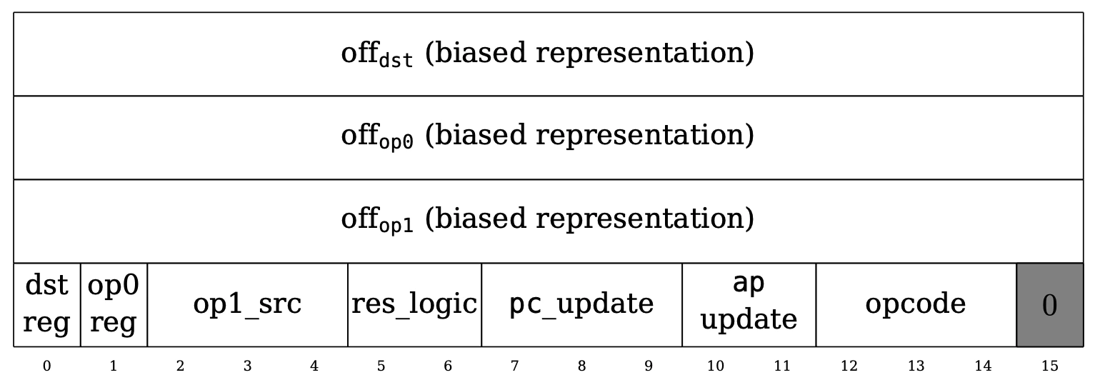 The next 15 bits are flags. The dst_reg and op0_reg 1-bit flags indicate whether to use the ap or the fp register as the base for the dst and op0 operands. The op1_src flag supports a wider range of base values for the op1 operand: op0, pc, fp, and ap. The res_logic flag indicates how to compute the res operand: op1, op0 + op1, or op0 * op1. The pc_update and ap_update flags show how to update the pc and ap registers after computing the operands. The opcode flag indicates whether this instruction belongs to a predefined opcode (e.g., CALL, RET, ASSERT_EQ) and also defines how the ap and fp registers should be updated.