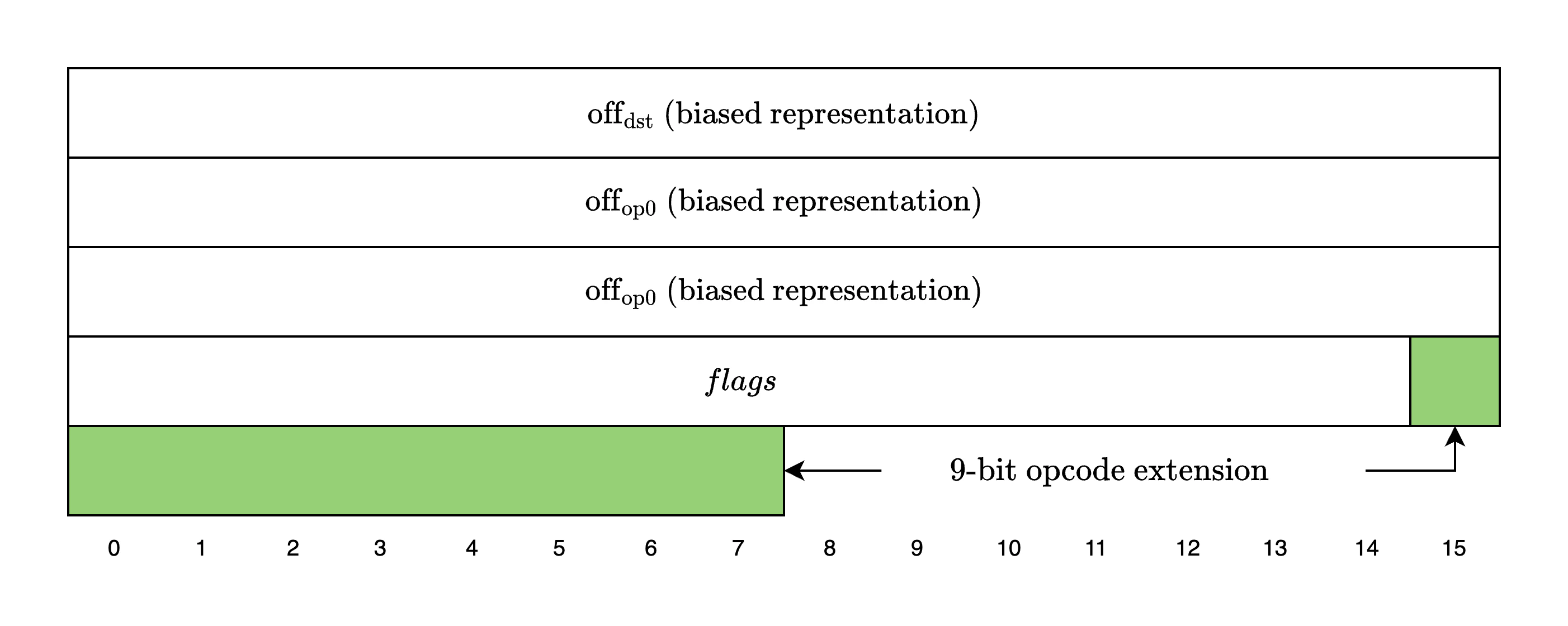 Since the 64-bit instruction structure is not flexible enough to support this extended set of opcodes, Cairo extends the instruction size to 72 bits and uses the last 9 bits as the opcode extension value.
