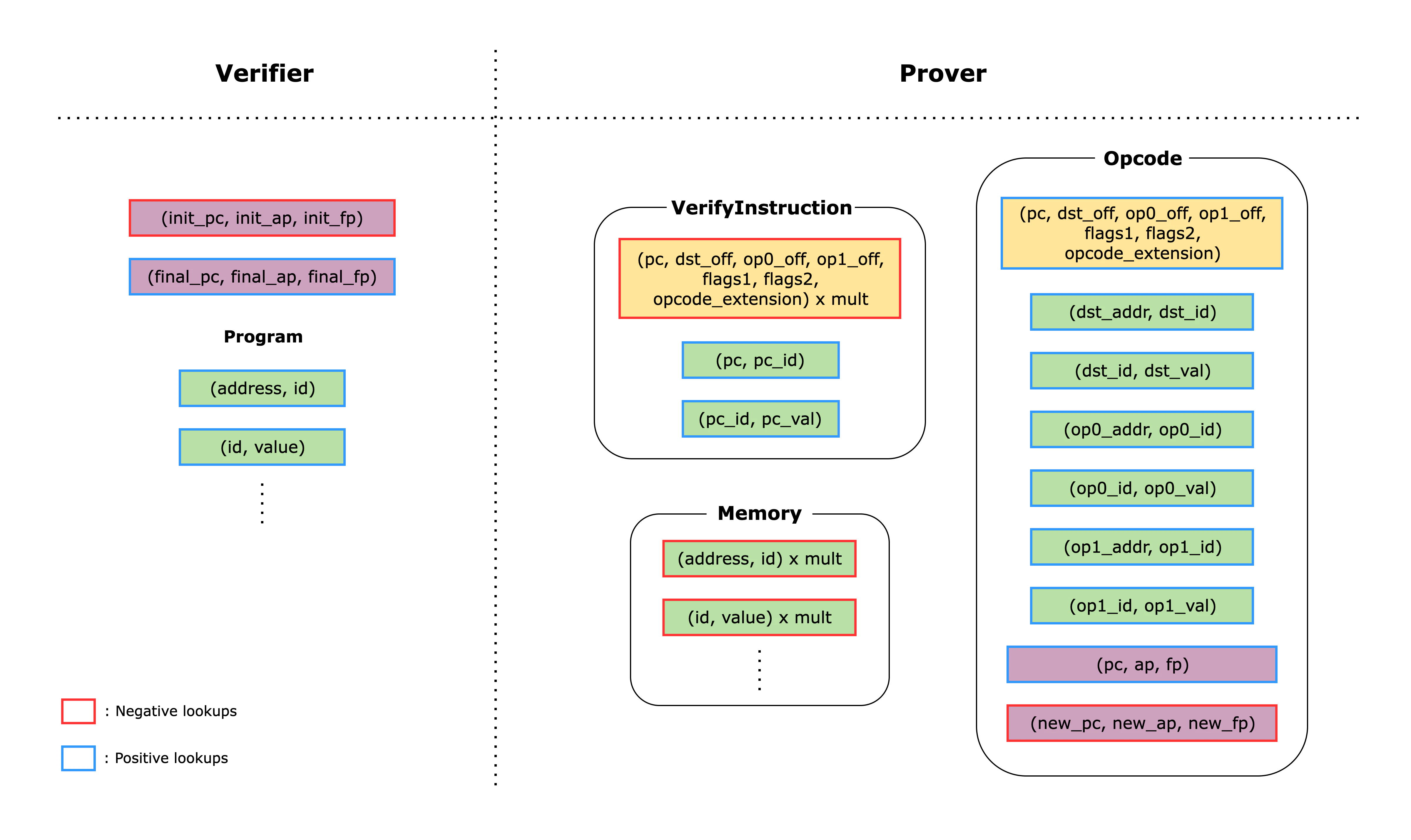 The following figure shows how each of the main components are connected to each other using lookups. If we look at the right-hand side first, we can see the main components of the Cairo AIR. The boxes in each component correspond to lookups within that component, and boxes with the same fill color correspond to lookups of the same values. Some lookups are yielded (i.e., subtracted), while others are used (i.e., added). Yielded lookups have red edges; used lookups have blue edges. On the left-hand side, we can see lookups that are computed directly by the verifier from data provided by the prover as part of the proof. Each component has a claimed sum value that corresponds to the sum of all the lookups in the component. These claimed sums are provided by the prover as part of the proof, and the verifier adds them together along with the lookups on the left-hand side. If the total sum is zero, the verifier is convinced that the proof is valid.