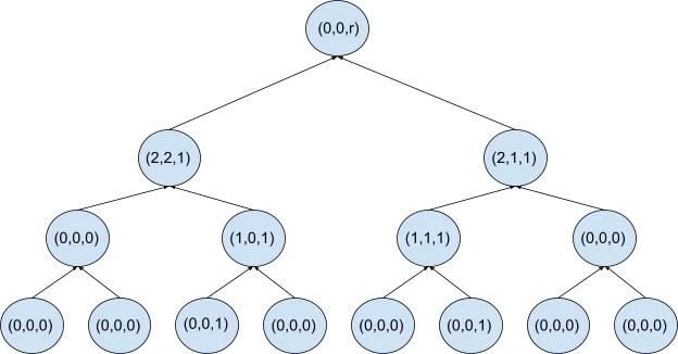 Length is specified, and cannot be deduced from , because the numbers in the triplet are field elements of fixed size, 251 bits each.For a node where , leads to the highest node whose left and right children are not empty.